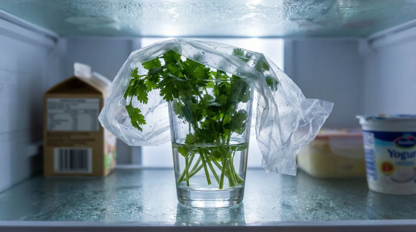 Finally, the secret step that completes the micro-climate. Take a clean, thin plastic sandwich bag and place it loosely over the top of the coriander leaves, like a makeshift greenhouse. Do not seal it tightly around the glass. Place this little green arrangement upright on a shelf in your fridge. Change the tap water every few days, and your coriander will remain vibrantly alive and fragrant for weeks.