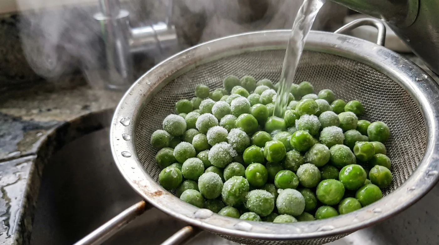 Pour your desired portion of frozen garden peas straight from the freezer bag into the sieve. Do not let them thaw on the worktop beforehand; you want them to remain as hard as little pebbles right up until the water hits them.